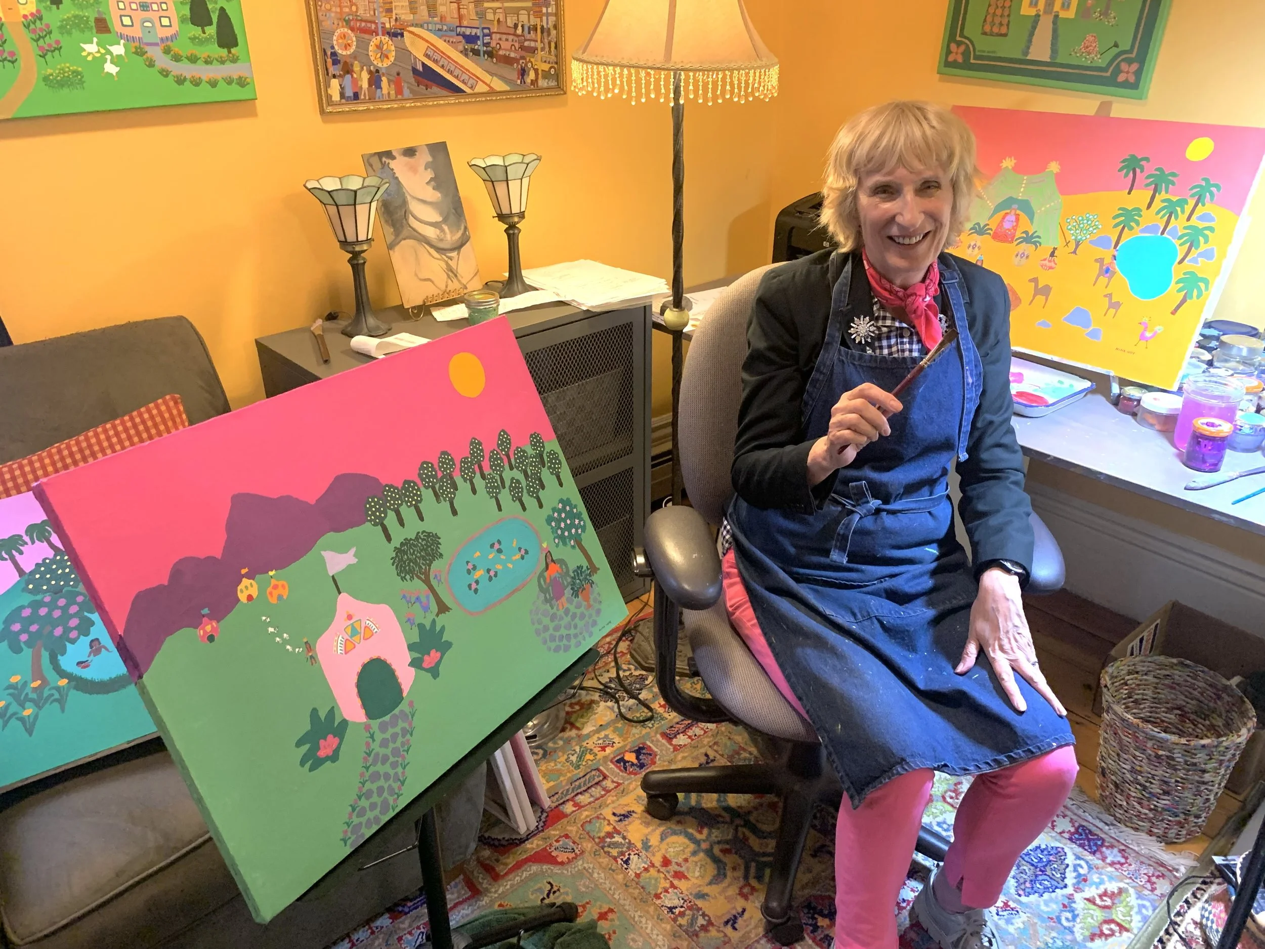 I work in acrylics because they give me the density of color I like and freedom to mix any color I choose. Artistically, I aim to create paintings that are joyous, playful, and engaging. I have deliberately bypassed formal training, so my artwork remains true to who I am. My favorite comment about my artwork is “I’d like to live in that little world!”